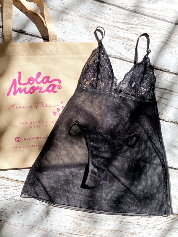 Pijama baby doll de microtul y encaje, con less regulable de encaje a juego.